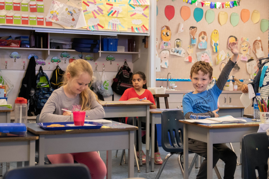 The bell rings, and the kids are lined up outside the door. Ms. Hamnett teaches Grades 2 and 3 this term, and several 7- and 8-year-olds start to enter the class. They put their backpacks and lunch bags away in their labeled cubbies at the back of the class, and start to settle into their desks.